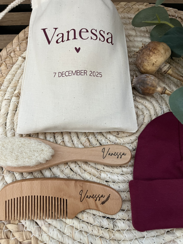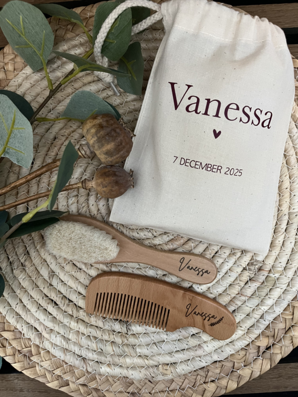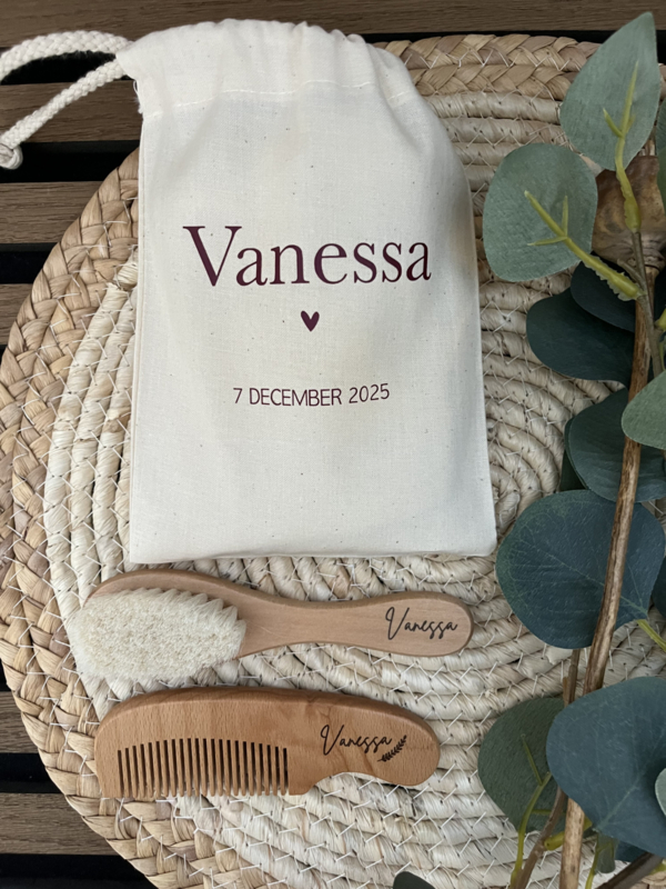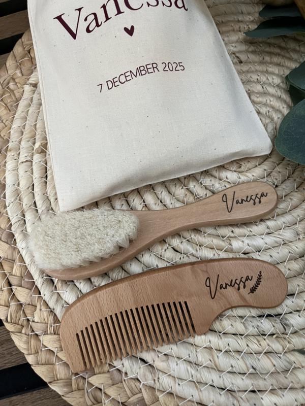 De borstel en kam worden lasergegraveerd met de naam van jouw mini, waardoor het setje niet alleen praktisch is, maar ook een prachtig blijvend aandenken. Lief voor thuis, fijn voor onderweg en súper leuk om cadeau te geven.