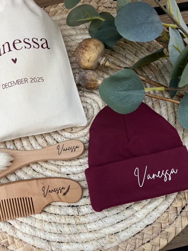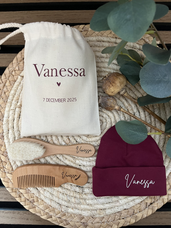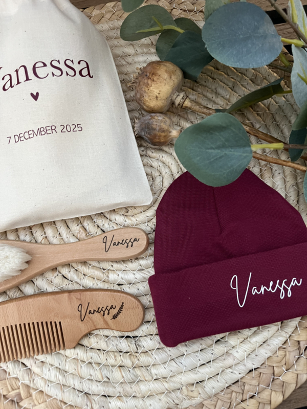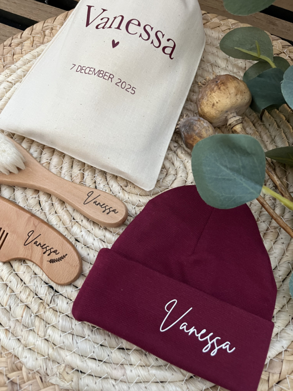 Kies dan voor het gepersonaliseerde naturel zakje, bedrukt met naam en geboortedatum. Zo bewaar je het setje mooi bij elkaar én wordt het een echt bewaarcadeautje.