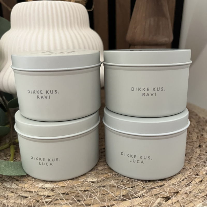 Aan de zijkant van het blik kun je optioneel een “dikke kus van…” met naam toevoegen. Zo wordt het een cadeautje dat ze zeker bewaart.